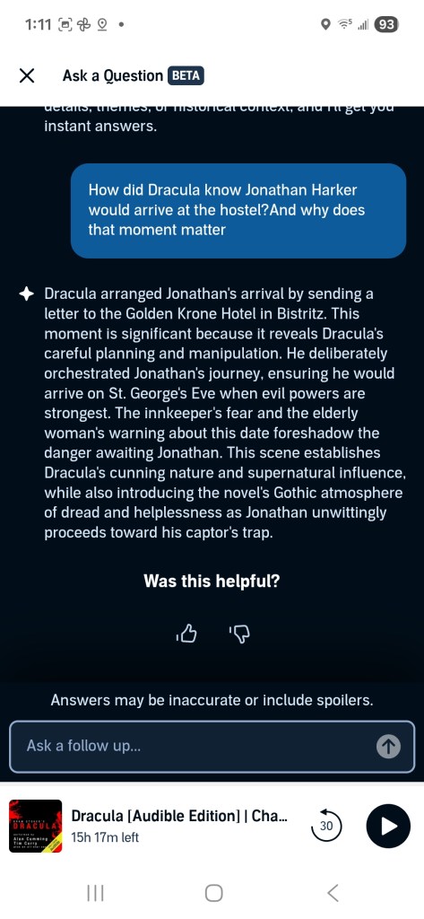 The AI answered in about 1 second: “Dracula arranged Jonathan’s arrival by sending a letter to the Golden Krone Hotel in Bistritz. This moment is significant because it reveals Dracula’s careful planning and manipulation. He deliberately orchestrated Jonathan’s journey, ensuring he would arrive on St. George’s Eve when evil powers are strongest. The innkeeper’s fear and the elderly woman’s warning about this date foreshadow the danger awaiting Jonathan. This scene establishes Dracula’s cunning nature and supernatural influence, while also introducing the novel’s Gothic atmosphere of dread and helplessness as Jonathan unwittingly proceeds toward his captor’s trap.” A thumbs-up or thumbs-down prompt followed, along with a caution that answers may be inaccurate or include spoilers.